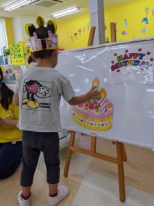 お誕生日会をしました。絵のケーキにロウソクを上手に立てました!
