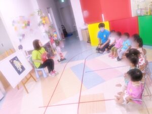 まずは、『たなばた』の歌を歌い、『たなばたまつり』の絵本を読みました。